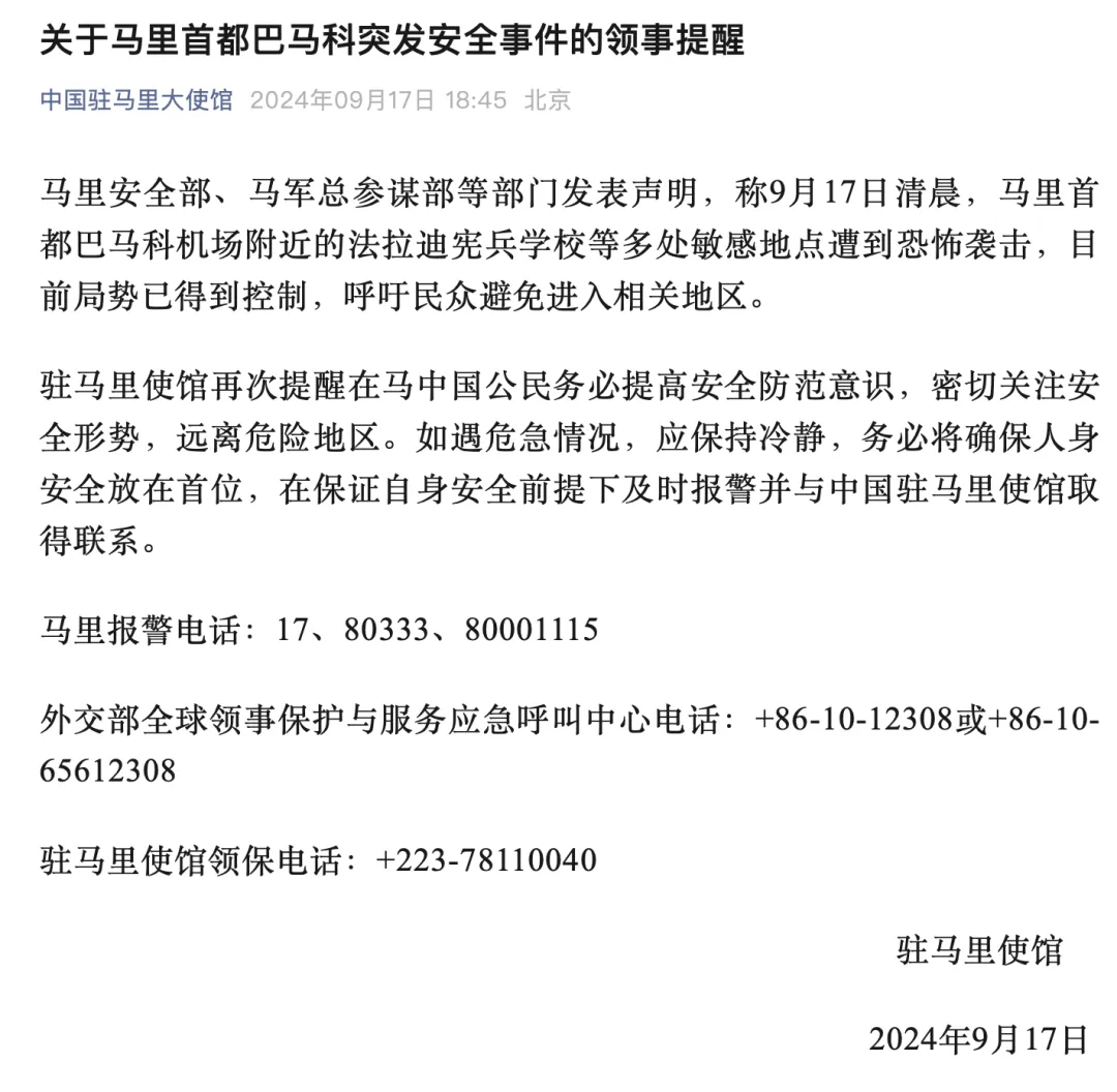 驻马里使馆再次提示在马中国公民务必进步安全督察果断,密切关爱安全时局,辩认危险地区。如遇危机情况,应保捏牢固,务必将确保东说念主身安全放在首位,在保证本身安全前提下实时报警并与中国驻马里使馆赢得相关。