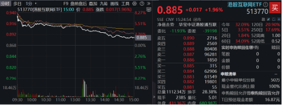 本日早盘港股集体走强,热点ETF方面,重仓港股互联网龙头的港股互联网ETF(513770)早盘跳空高开,场内价钱一度涨逾7%,午后随市回落,收涨1.96%,全天成交额10.05亿元,量能环比激增331%。