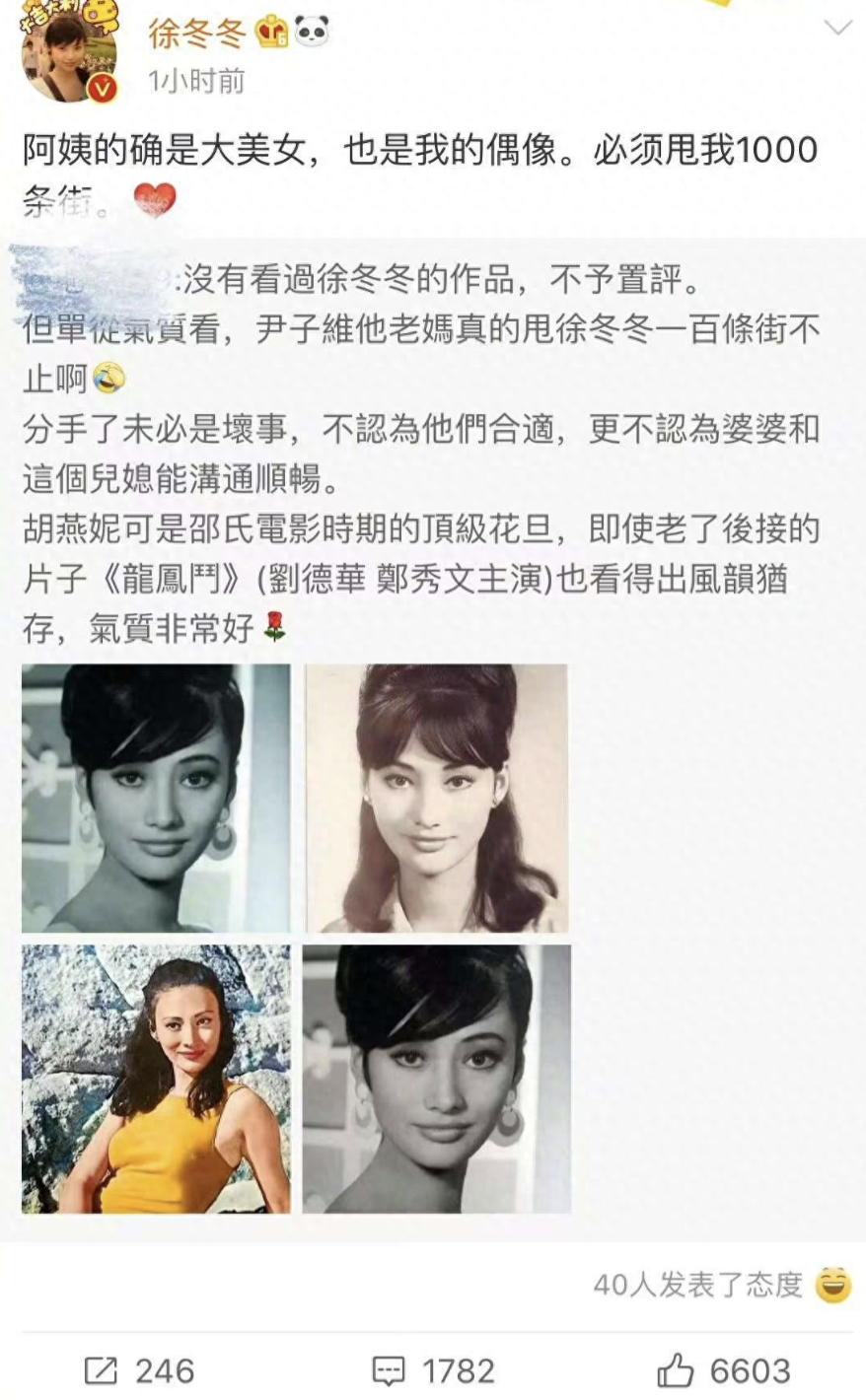 看了胡燕妮的旧照是不是就能领略网友拉踩她的儿媳妇徐冬冬:胡燕妮甩徐冬冬100条街。