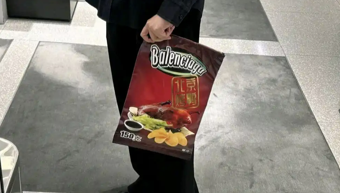 而此前6月,巴黎世家推出的一款“北京烤鸭”包袋,也激勉网友吐槽。该包外形与零食袋不异,呈长方形。包身正面印有一只烤鸭图案,还有“Balenciaga”“北京烤鸭”的字样,后面印有“养分要素”表,封口处有细长条拉链。该包外层为牛皮皮质,接管的是意大利顶级皮质,专柜售价15500元。